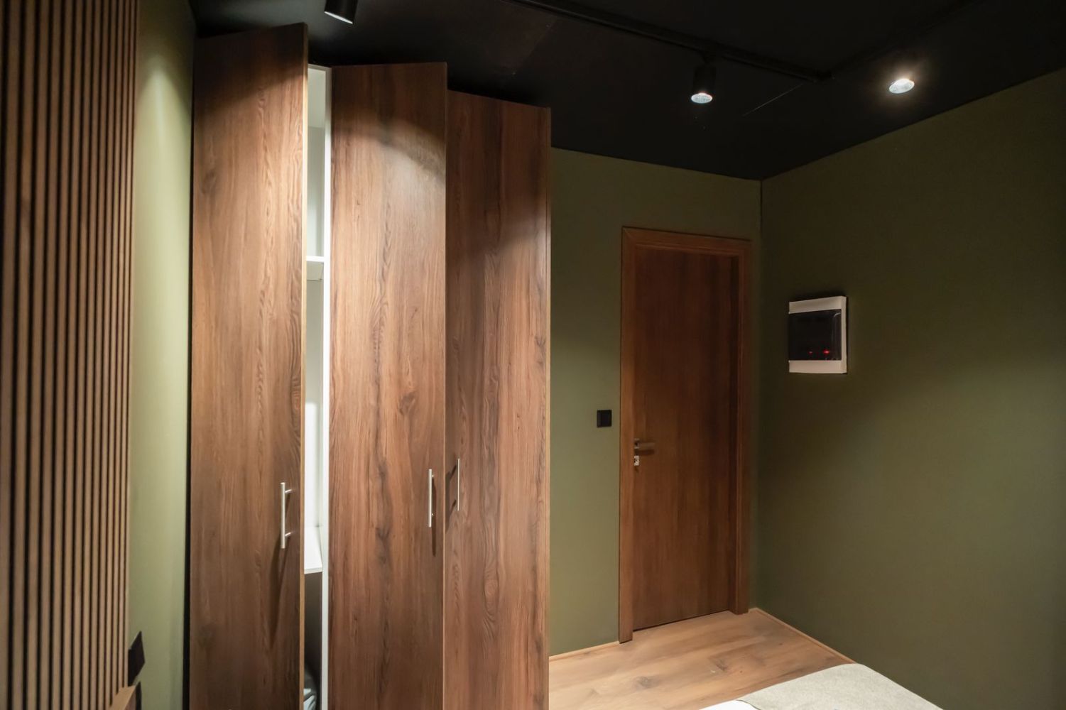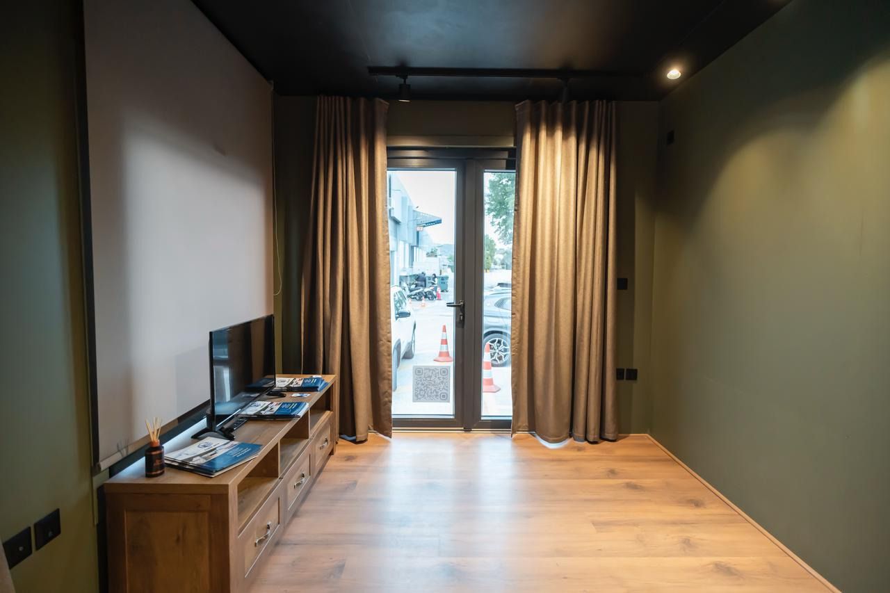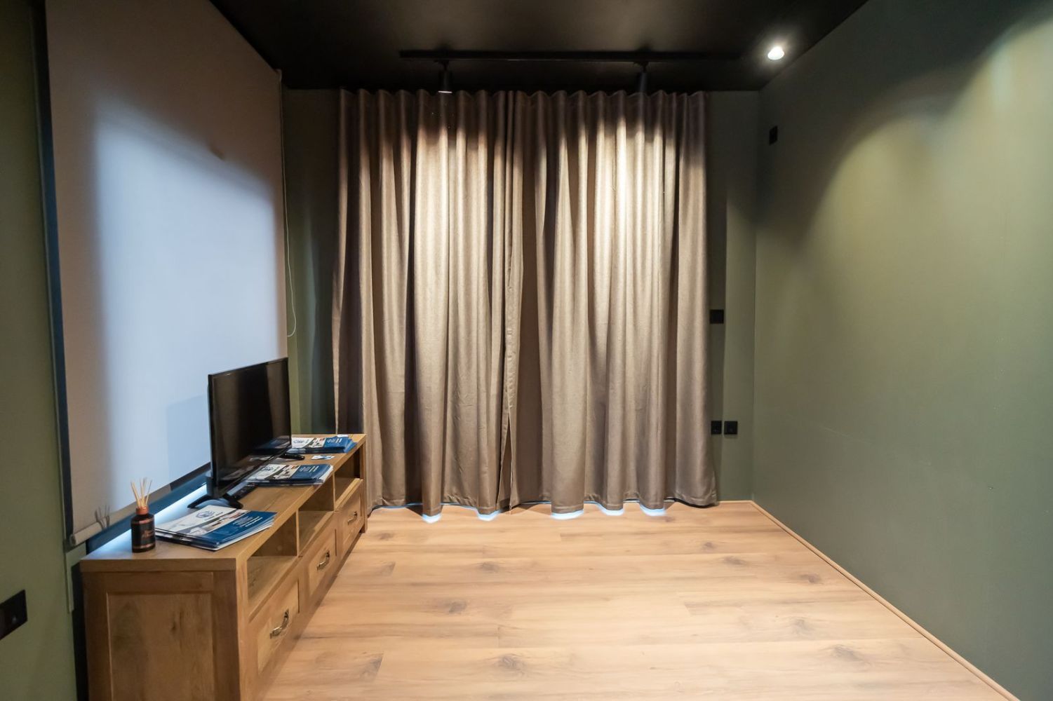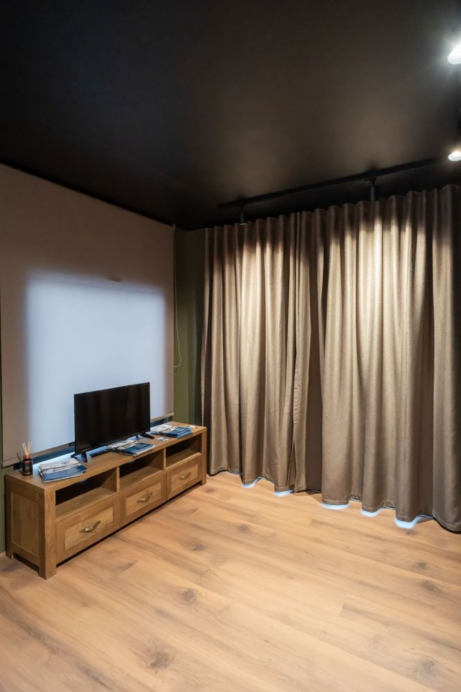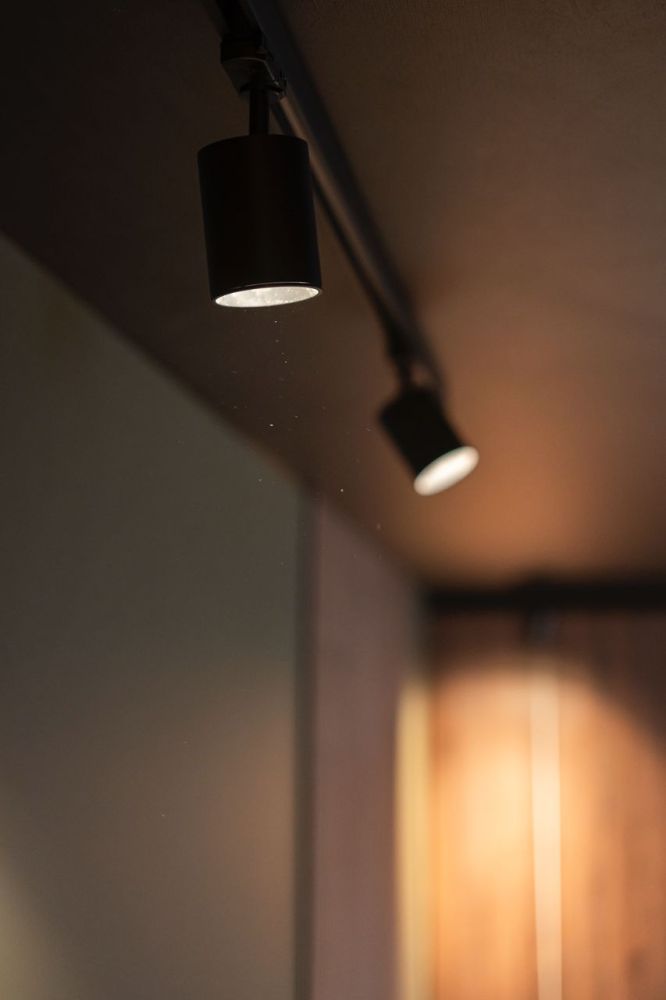 Ο φωτισμός είναι τοποθετημένος σε ράγες με περιστρεφόμενα σποτ για ευελιξία και σύγχρονο στυλ. Το μαύρο ταβάνι σε συνδυασμό με τις πράσινες αποχρώσεις στους τοίχους και τις ξύλινες λεπτομέρειες προσφέρει μια ιδιαίτερα κομψή και μοντέρνα αισθητική που ταιριάζει με κάθε διακοσμητικό ύφος.