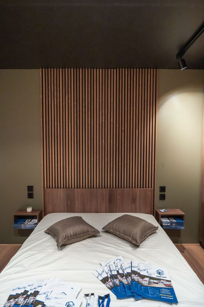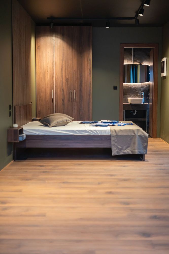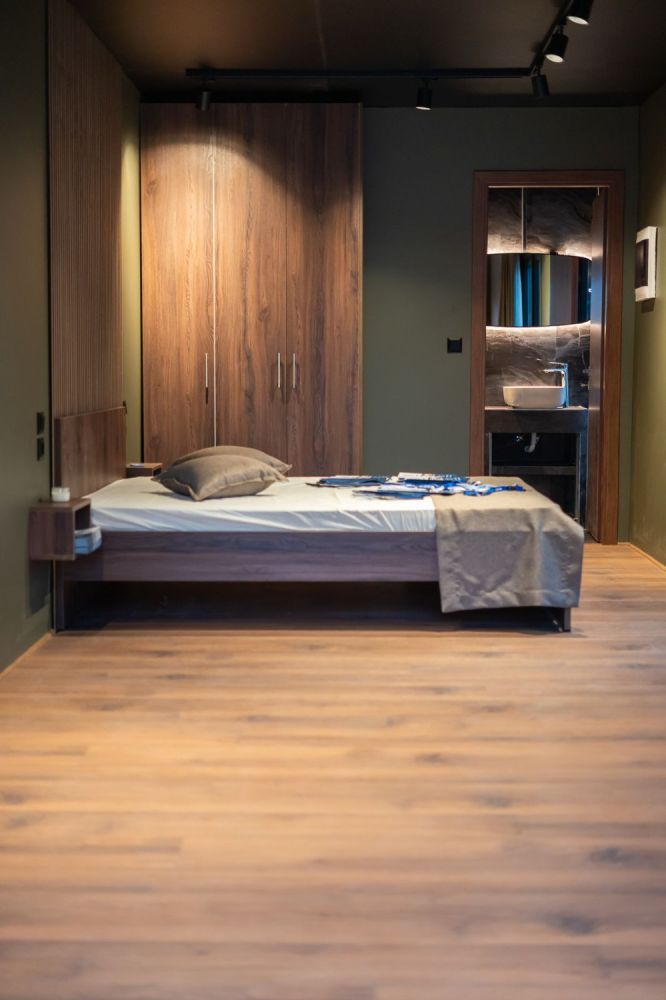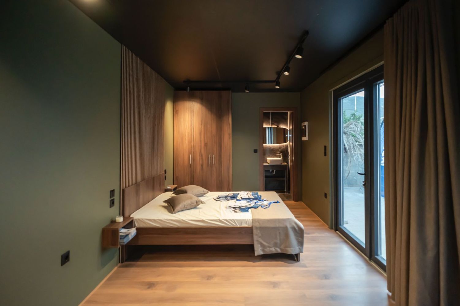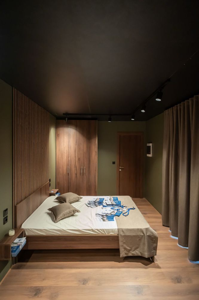 Το υπνοδωμάτιο περιλαμβάνει ξύλινο κρεβάτι με ενσωματωμένα κομοδίνα και custom επένδυση τοίχου με κάθετες ξύλινες γραμμές. Η ντουλάπα σε ίδια απόχρωση προσφέρει επαρκή αποθηκευτικό χώρο, ενώ οι κουρτίνες blackout εξασφαλίζουν ηρεμία και ιδιωτικότητα.