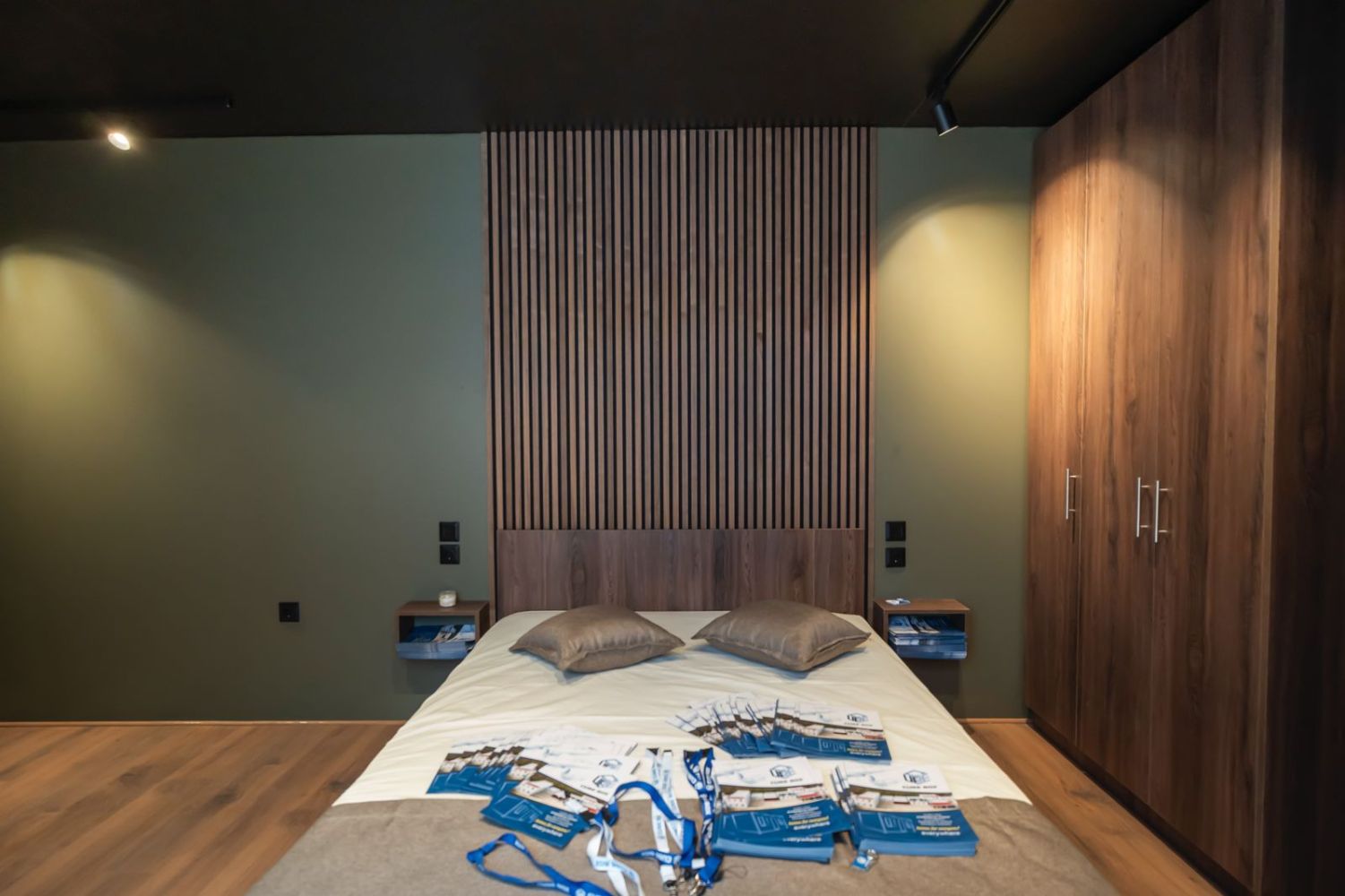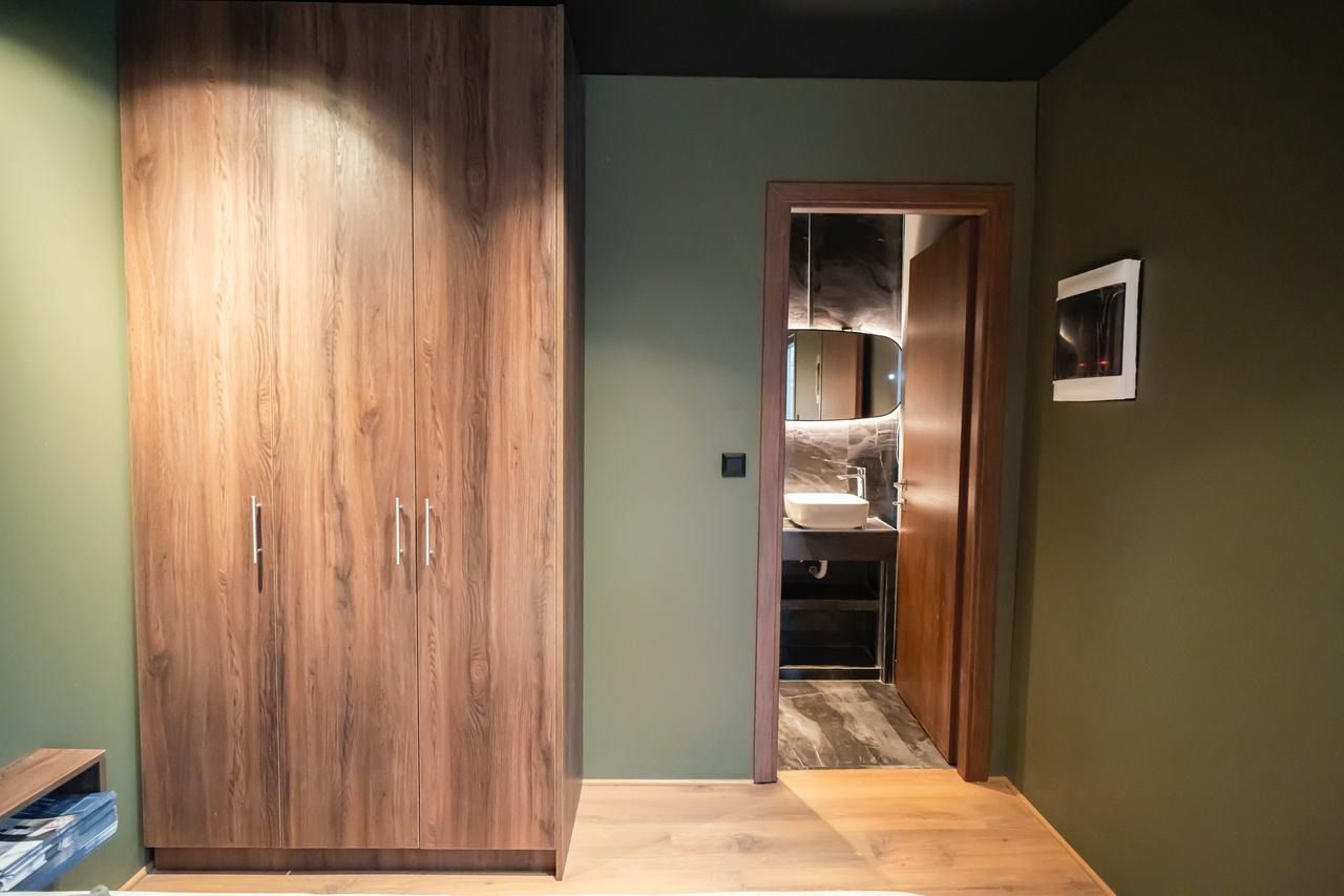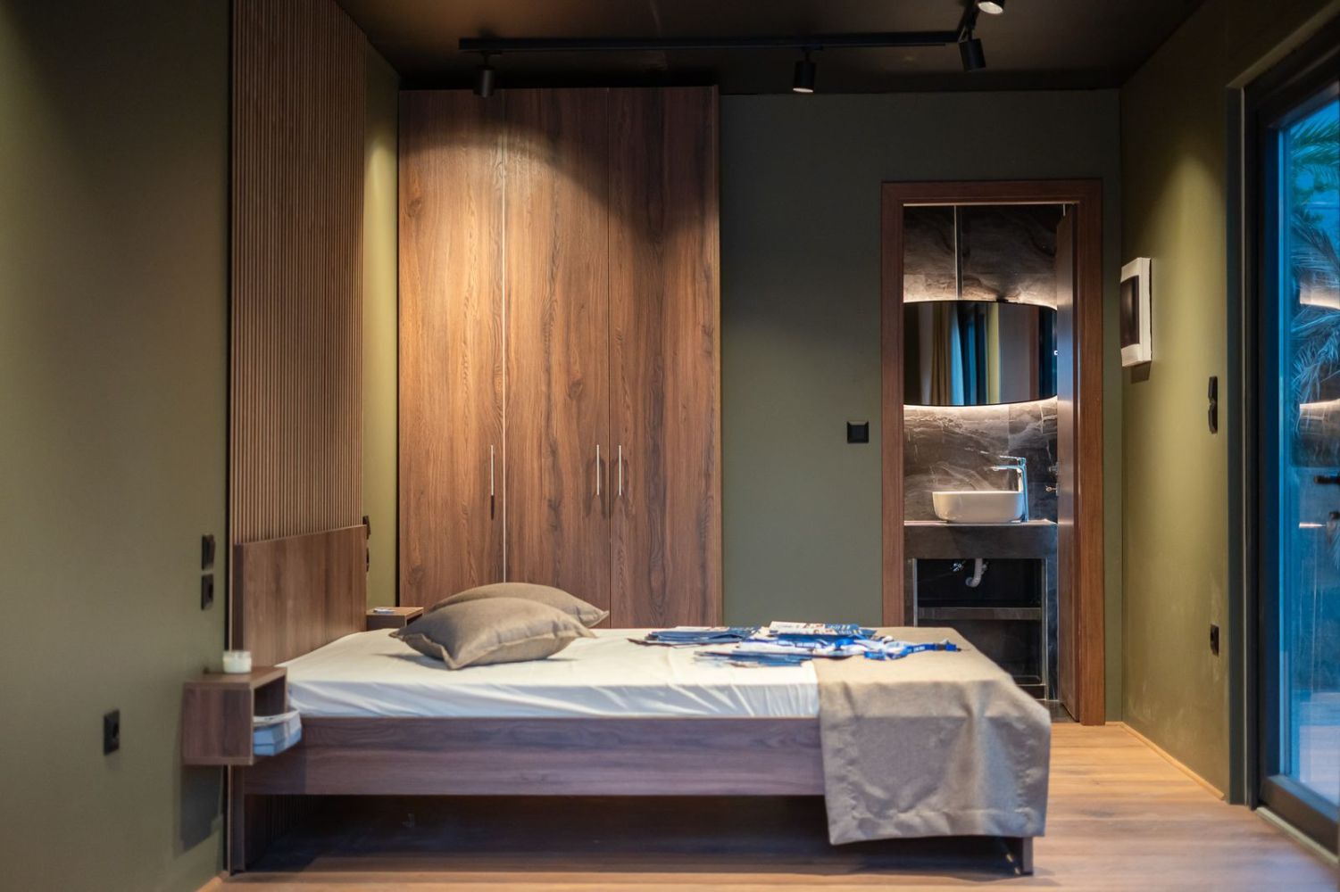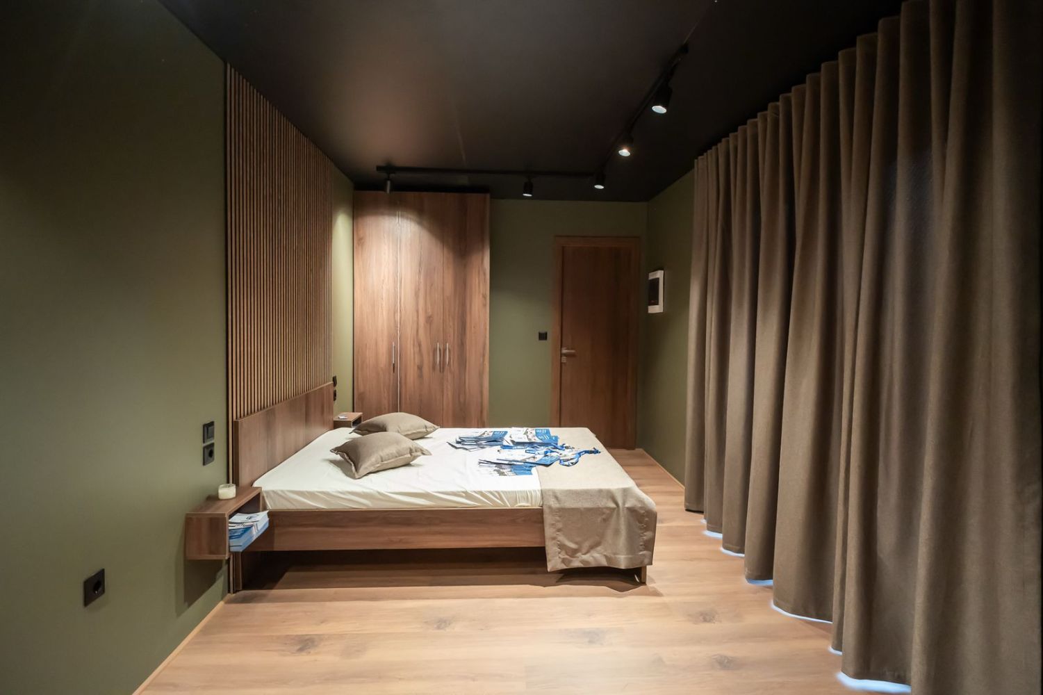 Το υπνοδωμάτιο περιλαμβάνει ξύλινο κρεβάτι με ενσωματωμένα κομοδίνα και custom επένδυση τοίχου με κάθετες ξύλινες γραμμές. Η ντουλάπα σε ίδια απόχρωση προσφέρει επαρκή αποθηκευτικό χώρο, ενώ οι κουρτίνες blackout εξασφαλίζουν ηρεμία και ιδιωτικότητα.