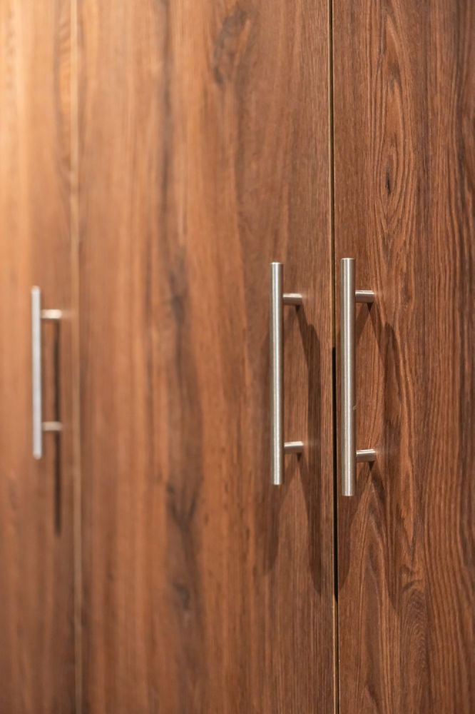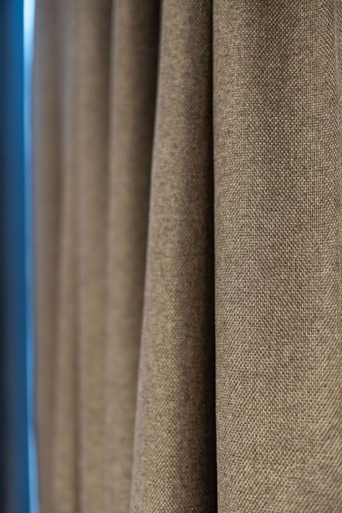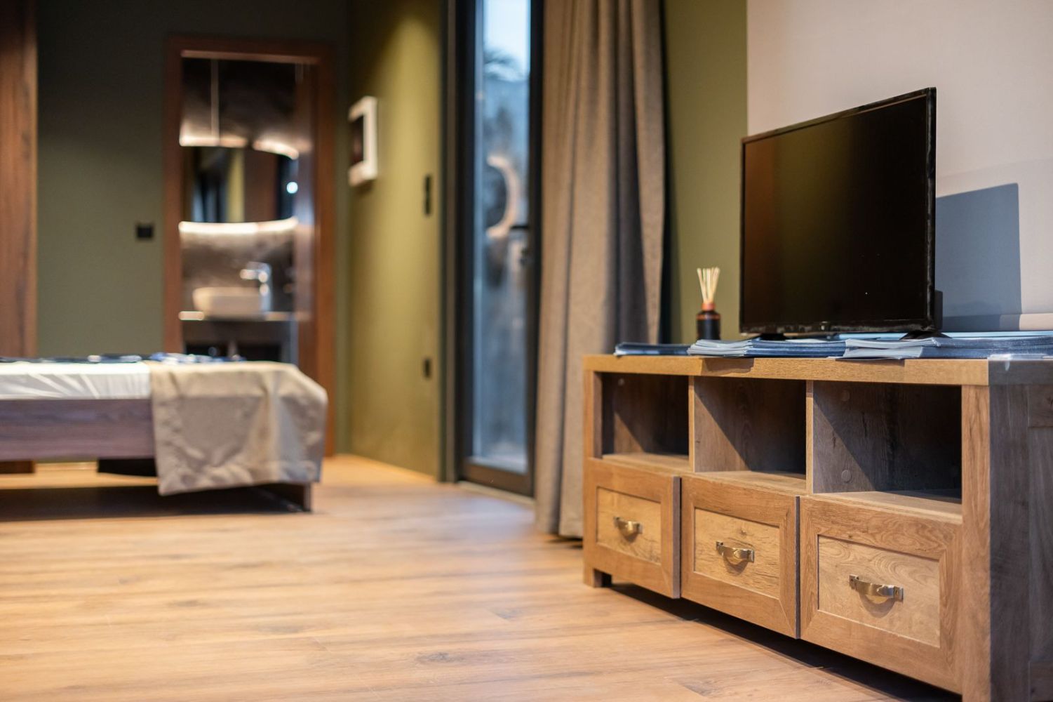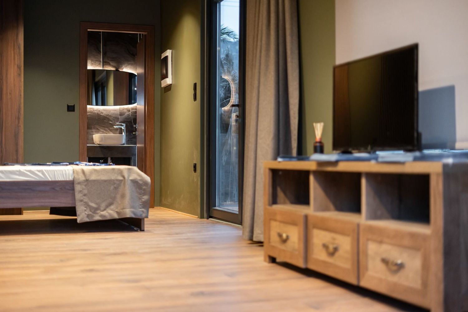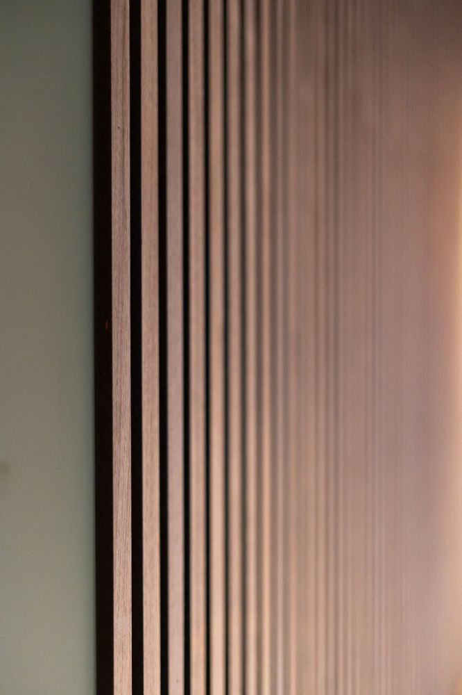 Το υπνοδωμάτιο περιλαμβάνει ξύλινο κρεβάτι με ενσωματωμένα κομοδίνα και custom επένδυση τοίχου με κάθετες ξύλινες γραμμές. Η ντουλάπα σε ίδια απόχρωση προσφέρει επαρκή αποθηκευτικό χώρο, ενώ οι κουρτίνες blackout εξασφαλίζουν ηρεμία και ιδιωτικότητα.