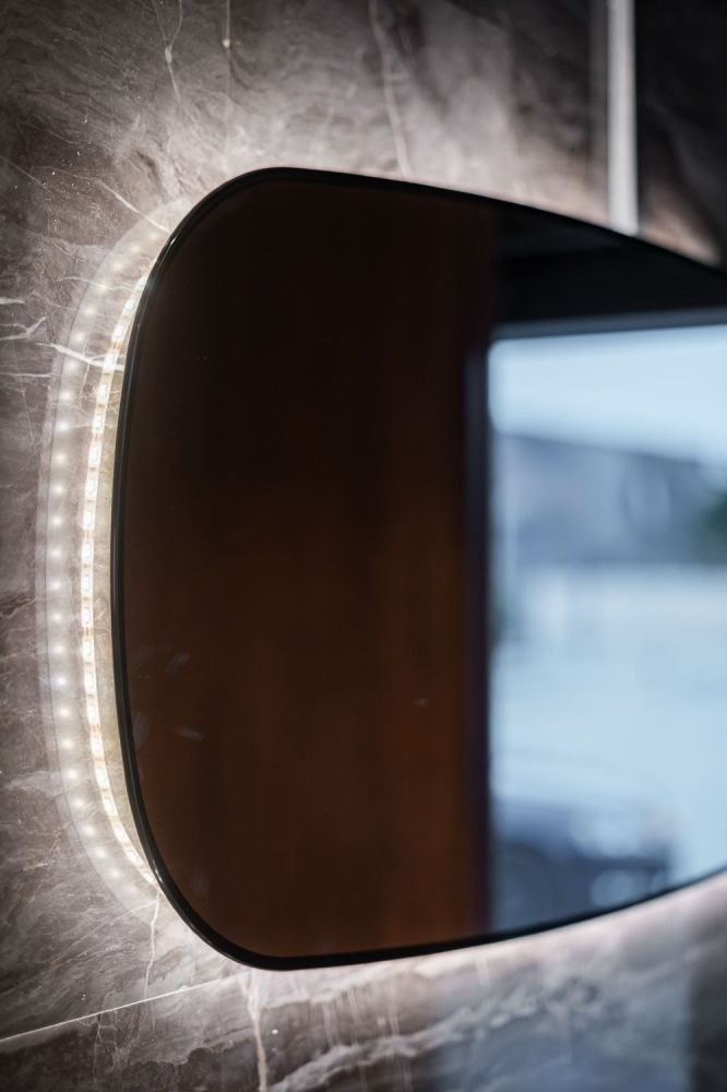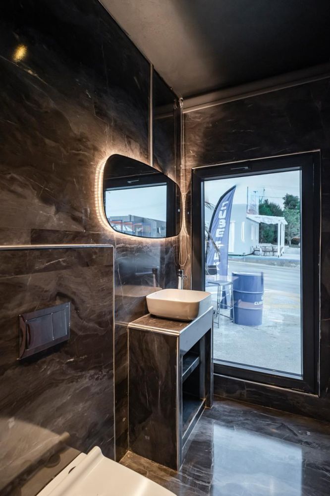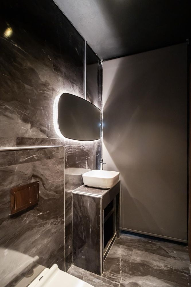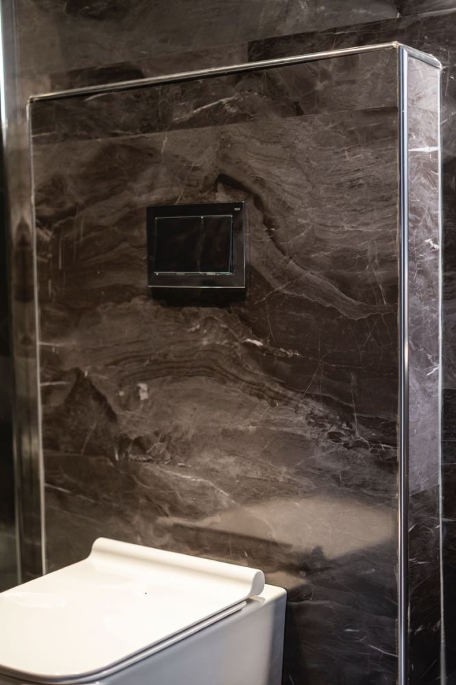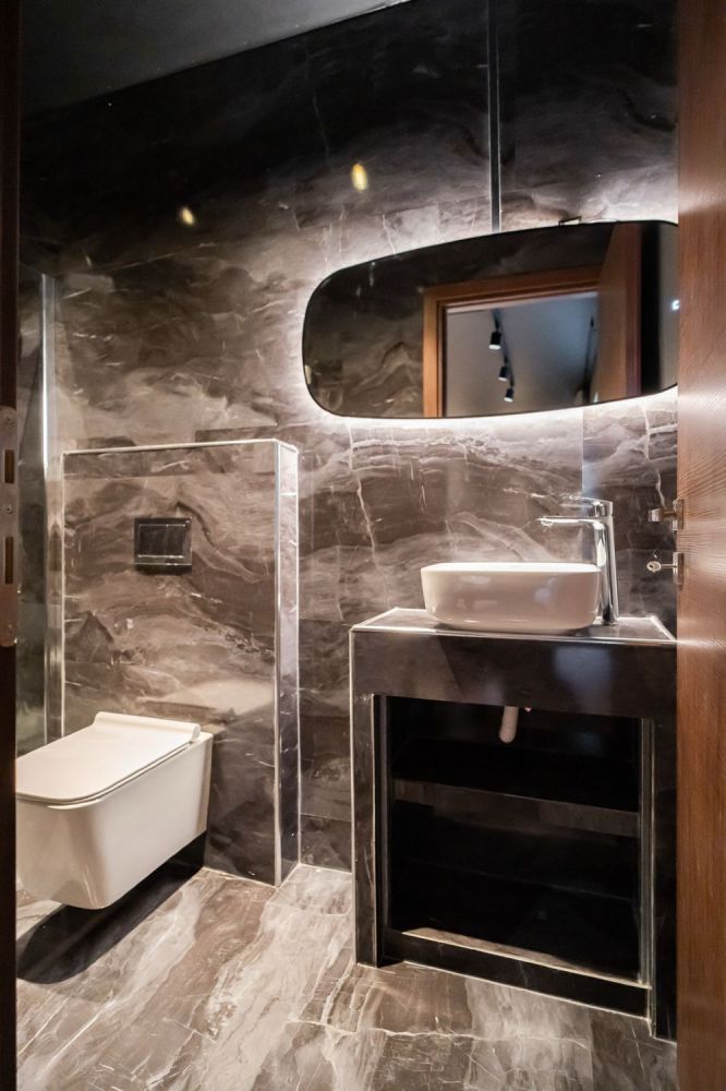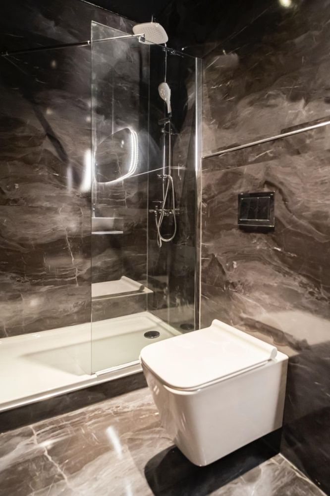Το μπάνιο έχει επενδυθεί με βινυλιακό υλικό σε εφέ μαρμάρου, προσδίδοντας πολυτέλεια και διαχρονικό στυλ. Περιλαμβάνει εντοιχιζόμενη λεκάνη με κρυφό καζανάκι, γυάλινη καμπίνα ντουζιέρας που εξοικονομεί χώρο και μοντέρνα έπιπλα με φωτιζόμενο καθρέφτη και λειτουργικό νιπτήρα. Ένας πλήρως εξοπλισμένος και πρακτικός χώρος που καλύπτει όλες τις καθημερινές ανάγκες.